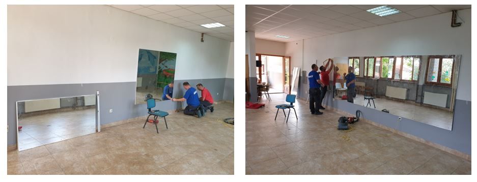 Krajem juna mjeseca uslijedio je teži dio posla, nabavka ogledala. Nakon što smo obišli i kontaktirali nekoliko staklorezačkih radnji u Derventi, Prnjavoru i Doboju, nismo mogli pronaći adekvatna ogledala koja bi prije svega bila bezbjedna za članove a zatim i mobilna ukoliko bi ih trebalo postaviti u neki drugi prostor. Ljepljenje ogledala na zid nije bila opcija zbog mobilnosti, a takođe ogledala bez čvrste podloge nisu bila bezbjedna opcija. Razumjevanje za naše zahtjeve opet je najviše imala firma “Niwex” d.o.o. kod kojih smo poručili 6 ogledala dimenzija 160 x 90 cm, na podlozi od iverice. Do kraja projektnog perioda obavljen je i posljednji korak, montaža ogledala i predstavljanje realizovanog projekta široj javnosti.