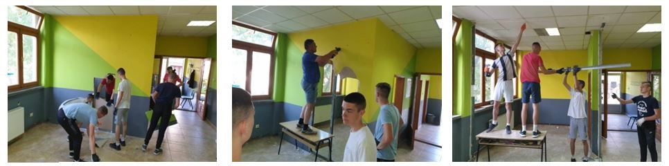 U toku maja mjeseca uslijedio je obilazak firmi te vodeći računa o kvaliteti proizvoda, brzini dostavljanja proizvoda kao i cijeni, odlučili smo se da saradnju ostvarimo sa firmom „Niwex“ d.o.o. iz Dervente u kojoj smo pronašli sve nephodno (jupol, lateks boju, sto, klupe i stolice). Uslijedile su pripreme za rušenje pregradnog zida i zajednička akcija sa volonterima iz SKUD-a „Derventa“ (članovima izvođačkog ansambla) koji su pomogli da se posao obavi u najbržem mogućem roku. Doprinos u ovom koraku pružila nam je i firma „Komunalac“ a.d. koji su obezbjedili odvoz otpada nakon rušenja zida.