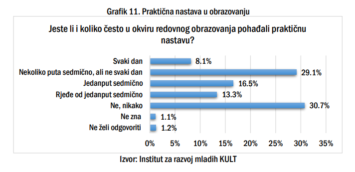 Da li znaš da imamo problem da postojeći sistem praktične nastave ne doprinosi razvoju radnih navika i potrebnih vještina za izlazak na tržište rada? Rezultati istraživanja, koje je sproveo Institut za razvoj maldih KULT za strategiju, pokazuju da 30,7% mladih nikada nije imalo priliku za praktičnu nastavu tokom svog obrazovanja, a samo 8,1% nas ima praktičnu nastavu svaki dan.