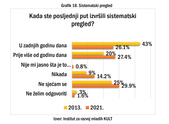 Recimo, prema istraživanjima, samo 26,1% mladih u FBiH obavilo je sistematski pregled u 2021. godini, i to većinom ne kao redovnu kontrolu nego zbog polaganja vozačkog ispita ili zaposlenja. U poređenju s 2013. godinom, kada je taj postotak bio 43%, vidimo da sve manje mladih vodi računa o svom zdravlju. Još alarmantnije, 14,2% mladih nikada nije obavilo sistematski pregled, što je porast u odnosu na 2013. kada je taj broj bio 9%.