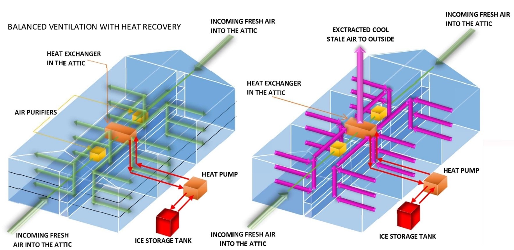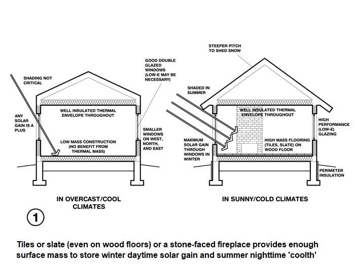 Slika 1 (lijevo). Podovi i kamin daju dovoljno površinske mase za skladištenje zimske dnevne toplote i noćne ljetne hladnoće Slika 2. (desno) Prirodna ventilacija skladišti noćnu hladnoću u unutrašnjosti da bi smanjila potrebu za klimatizacijom