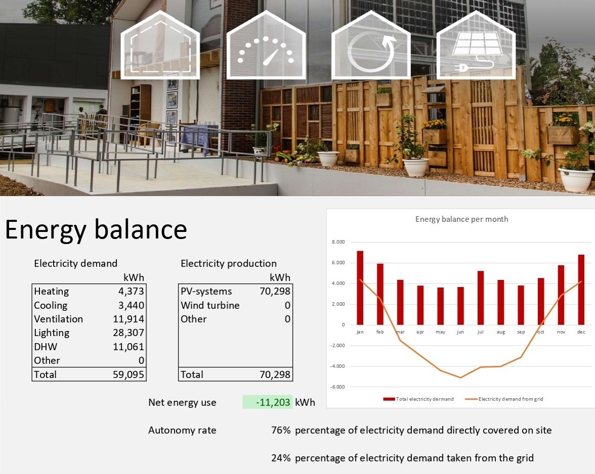 Završna aktivnost (slika 6) je izračunavanje konačnog energetskog balansa u zgradi, na osnovu podataka o proizvodnji električne energije ostvarene pomoću postavljenih solarnih panela i kolektora, rada efikasnih toplotnih pumpi. LED rasvjete i opreme sa odgovarajućim energetskim razredom u zgradi. U obračun ulaze i podaci o potrošnji tople vode, toplotni gubici i dobici iz prethodnog koraka proračuna energetskog balansa. Konačna tabela prikazuje ukupni energetski balans zgrade, autonomnost u proizvodnji struje tokom svih mjeseci u godini i za čitav godišnji period.