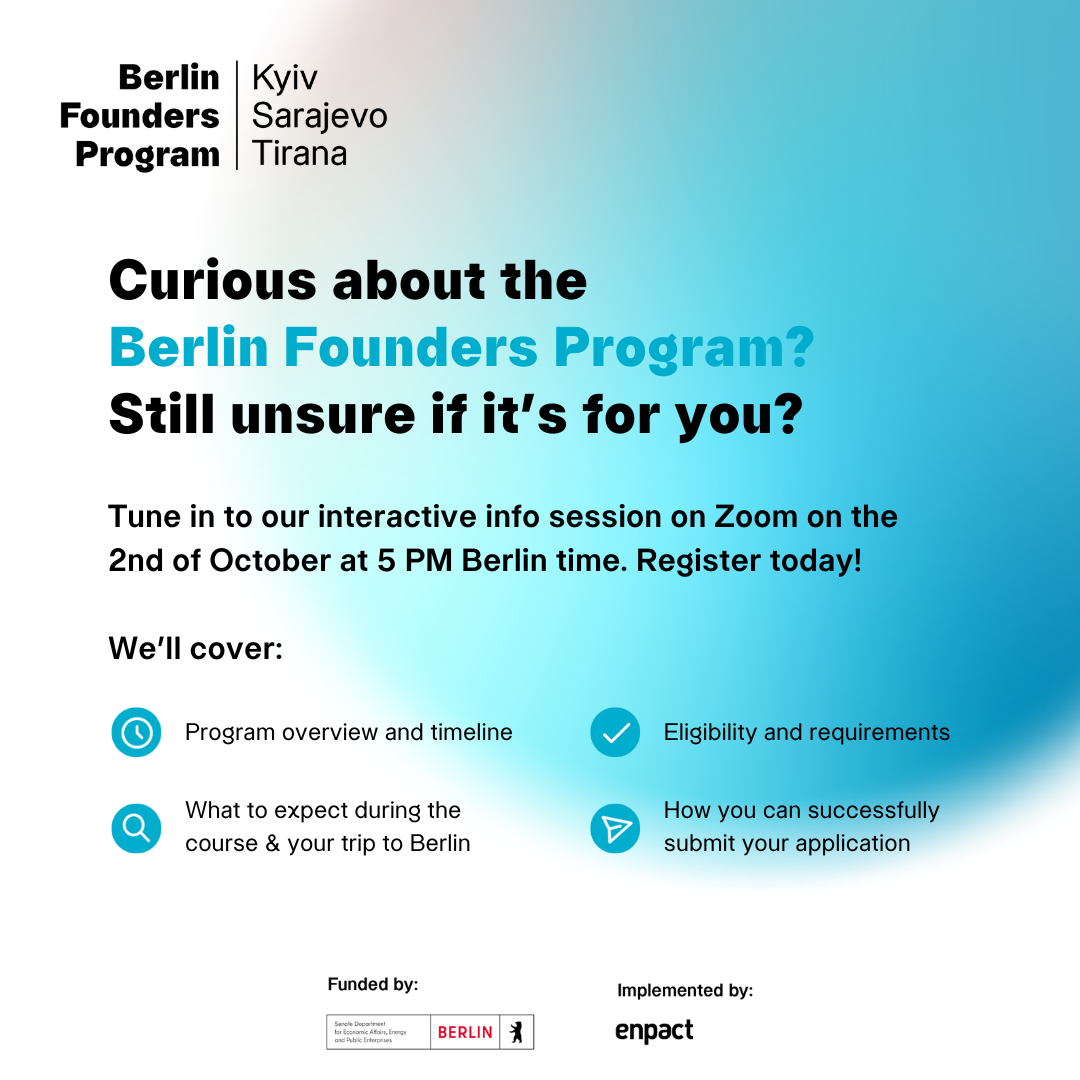 Berlin Founders Program je jedinstvena prilika za mlade poduzetnike iz Bosne i Hercegovine, Albanije i Ukrajine da pokrenu i razviju svoje vlastite biznise. Program je osmišljen da vas opremi ključnim znanjima o poduzetništvu, kako da pokrenete razvijate posao, osigurate financiranje, te pristupite međunarodnim tržištima. Nosilac programa je Senat za ekonomske poslove, energiju i javna preduzeća Berlina, a program implementira organizacija Enpact.