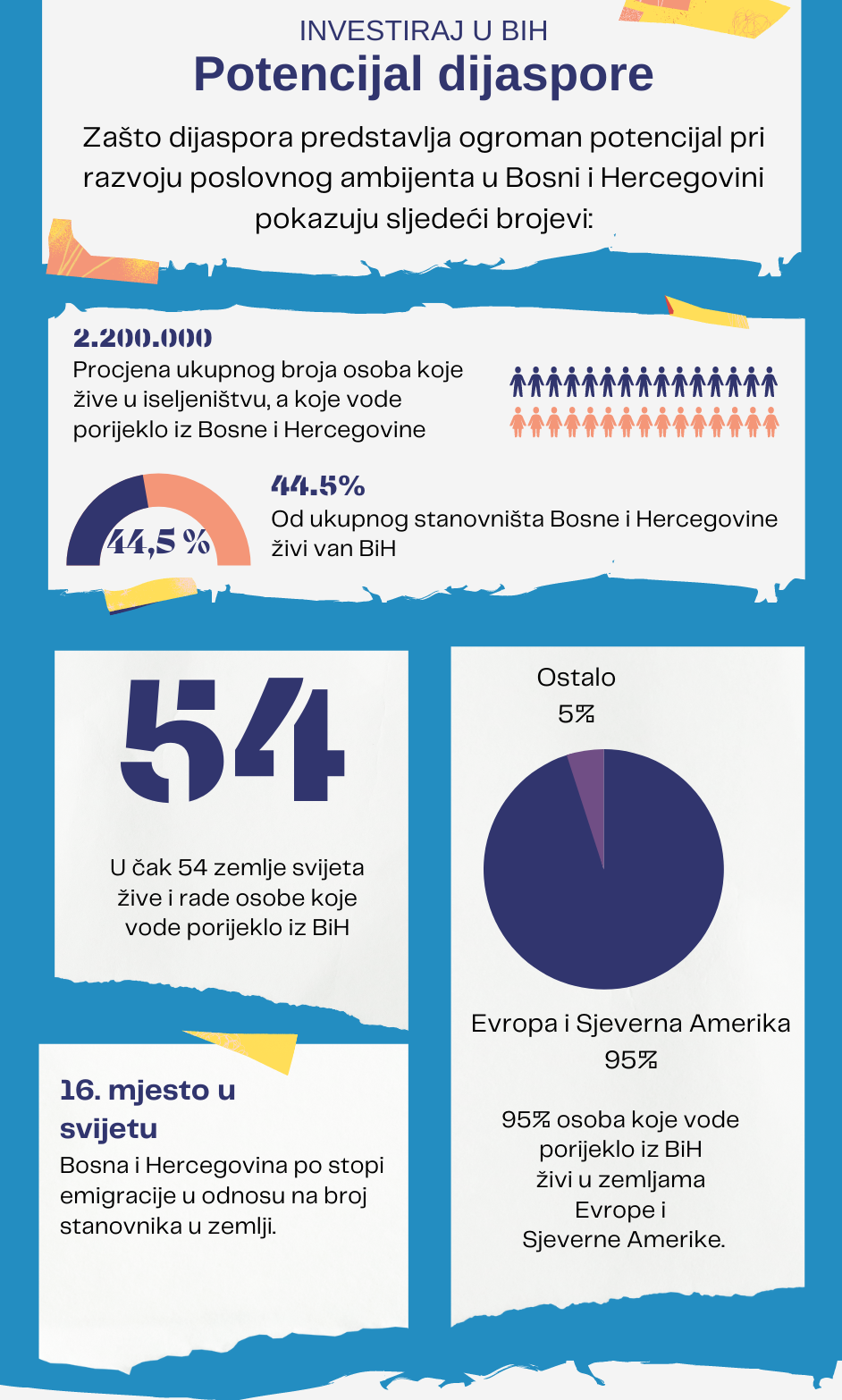 Obraćamo se dijaspori u nadi da će se brže, lakše i jednostavnije promovirati i kapitalizirati potencijali Bosne i Hercegovine, kao poželjne investicijske lokacije, kao i mogućnost da osobe koje vode porijeklo iz Bosne i Hercegovine brže, lakše i jednostavnije prenesu najbolje svjetske poslovne prakse i realizuju vlastite ideje i u Bosni i Hercegovini. Kao potvrda činjenici da je dijaspora značajan potencijal, govori sljedeći prikaz: