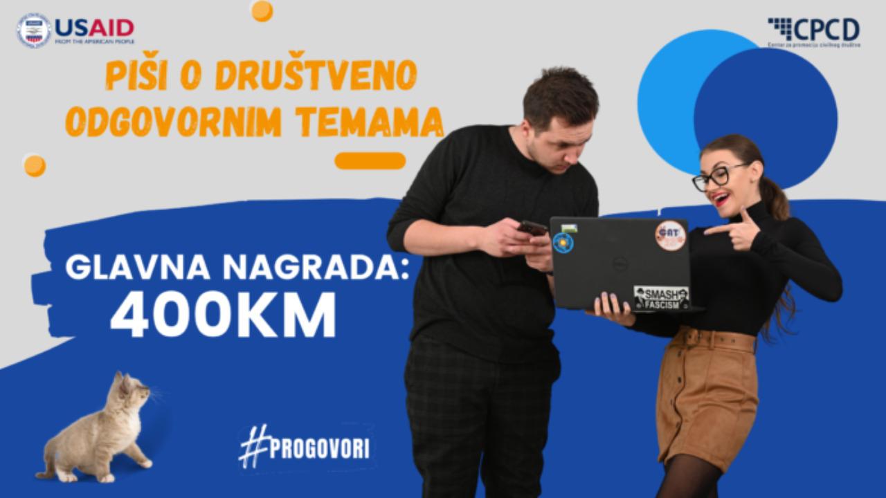 Centar za promociju civilnog društva (CPCD) u saradnji sa Omladinskim resursnim centrom (ORC) Tuzla kroz tim CAT BiH (Citizens Against Terrorism) poziva sve građane i građanke Bosne i Hercegovine da se prijave za učešće u nagradnom konkursu #Progovori koja se realizuje u okviru USAID-ovog Programa osnaživanja nezavisnih medija (IMEP).