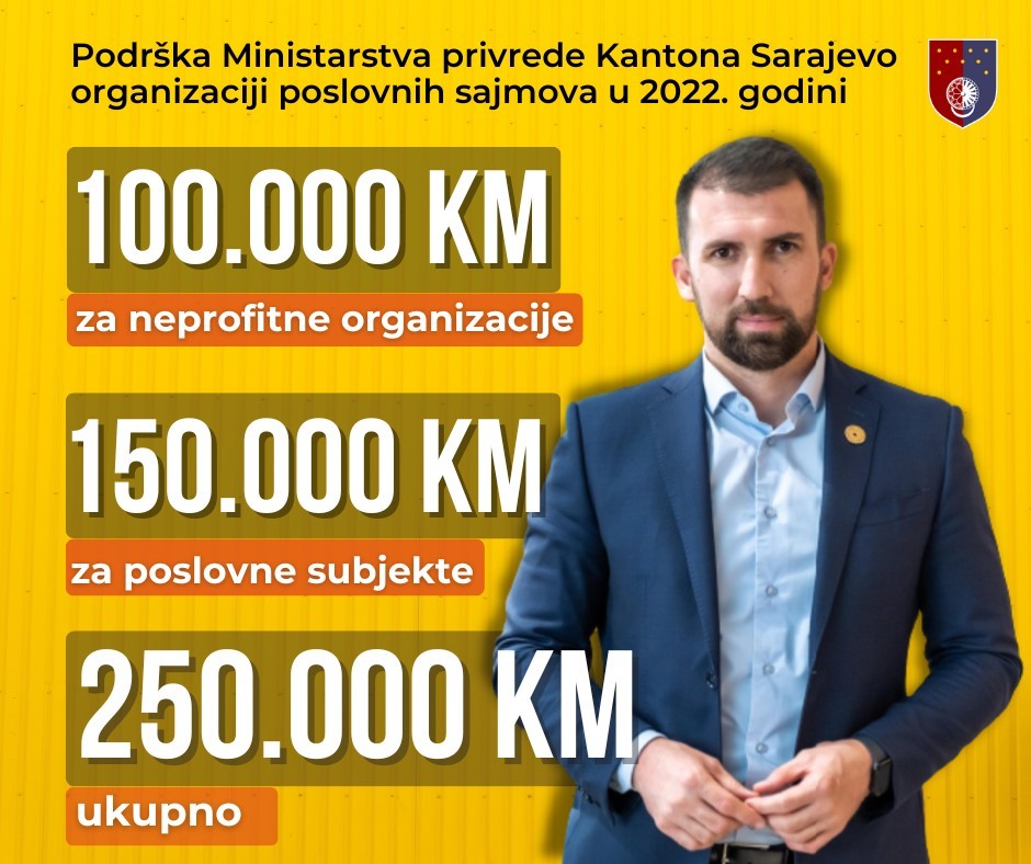 Ministarstvo privrede Kantona Sarajevo objavilo je još jedan Javni poziv za sufinansiranje (dijela troškova) programa i projekata, ali sada za projekte poslovnih subjekata (obrt, d.o.o.) za organizovanje poslovnih sajmova ili sličnih manifestacija u svrhu promocije poslovnih subjekata i razvoja privrede u Kantonu Sarajevo za 2022. godinu “POSLOVNI SAJMOVI 2022”.