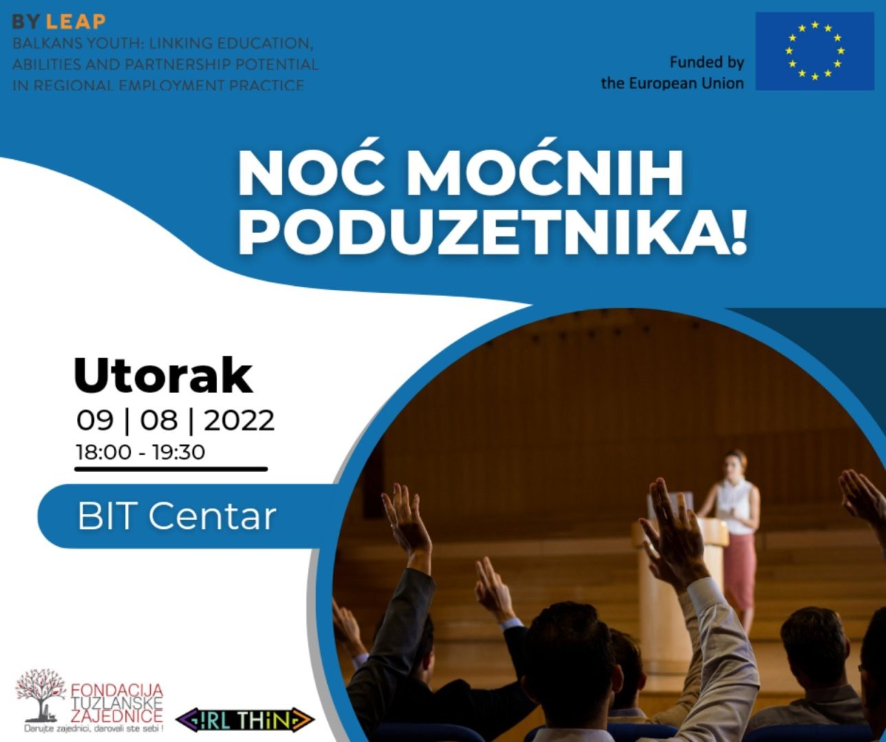 Udruženje mladih žena “GirlTHing” učestvuje u sklopu projekta “BY LEAP” (“Balkans Youth: Linking Education, Abilities and Partnership Potential in Regional Employment Practice” – “Omladina Balkana: Povezivanje obrazovanja, vještina i mogućnosti za partnerstvo u regionalnim praksama zapošljavanja”) finansiranog od strane Europske unije. Cilj samog projekta je doprinijeti poduzetničkim mogućnostima mladih, te ojačati perspektivu zapošljavanja i pokretanja vlastitog biznisa.