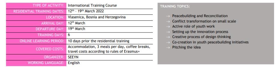 “EUREKA EFFECT” – Trening o društvenoj inovaciji procesa pomirenja kroz rad s mladima koristeći međusektorski pristup i različite metode dizajna. Ovim treningom žele izgraditi kapacitete i unaprijediti vještine iskusnih radnika i radnica s mladima u inoviranju i redizajniranju njihovih pristupa i aktivnosti prema pomirenju i saradnji mladih, osnažujući izgradnju mira, pružajući dublji i društveno odgovorniji program rada s mladima.