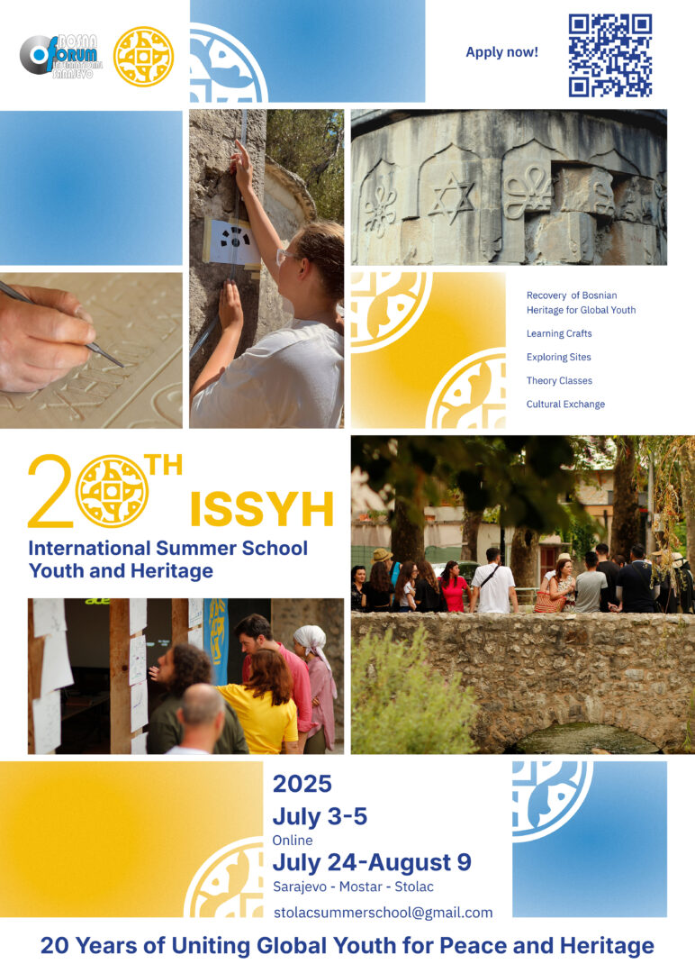 20. Internacionalna ljetna škola Mladi i naslijeđe bit će organizirana između 24. jula i 9. avgusta 2025. u Sarajevu, Mostaru i Stocu, Bosna i Hercegovina. Uvodna predavanja bit će online između 3. i 5. jula 2025.