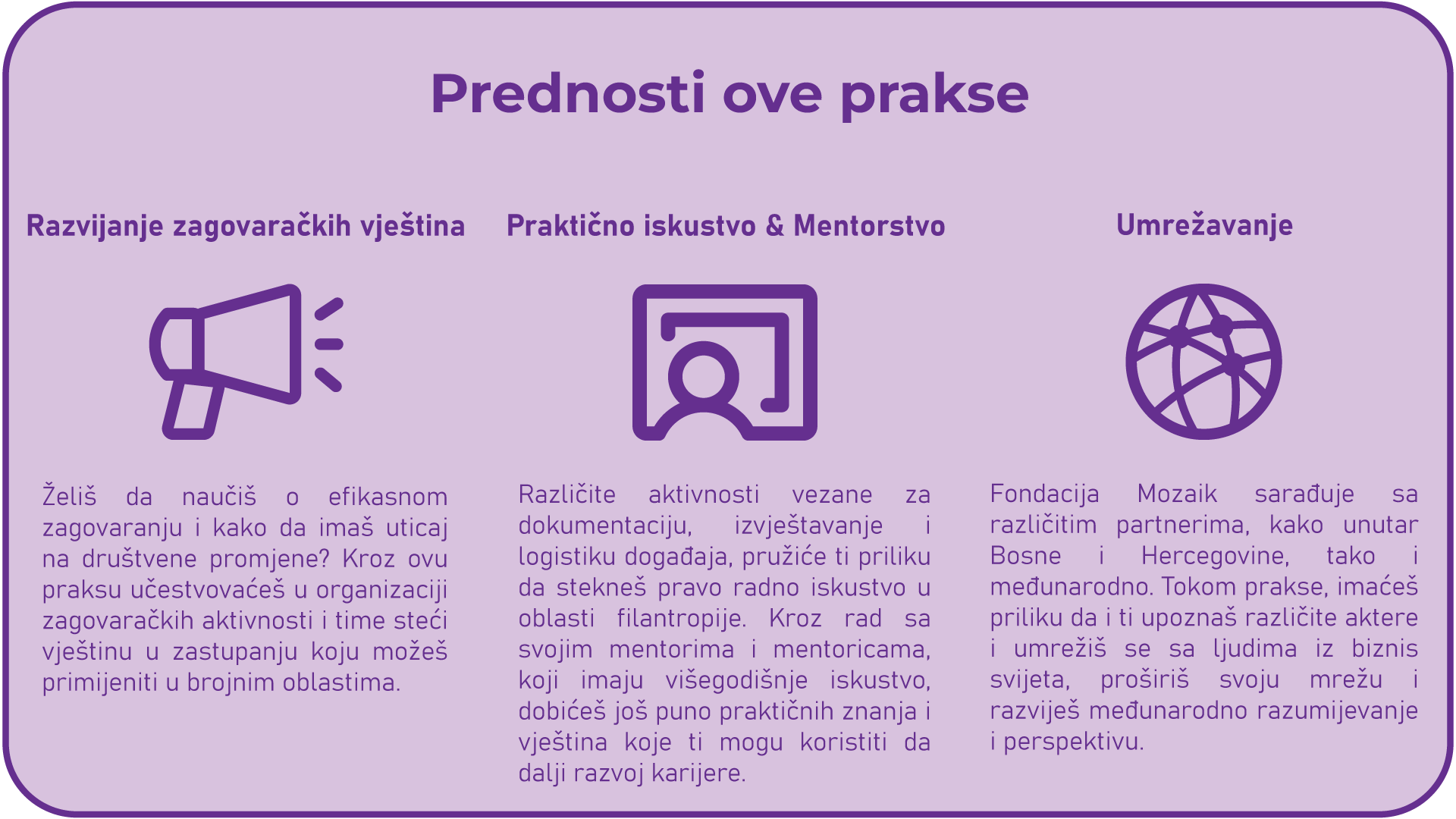 Praksa u filantropiji je idealna ukoliko si zainteresovana ili zainteresovan za rad u neprofitnom sektoru i želiš razviti vještine upravljanja projektima, analitičke sposobnosti i komunikacione veštine. Rad u ovoj oblasti ti pruža priliku da stvarno doprineseš promjeni i podršci zajednice. 🙋🏻♀️🙋🏻♂️
