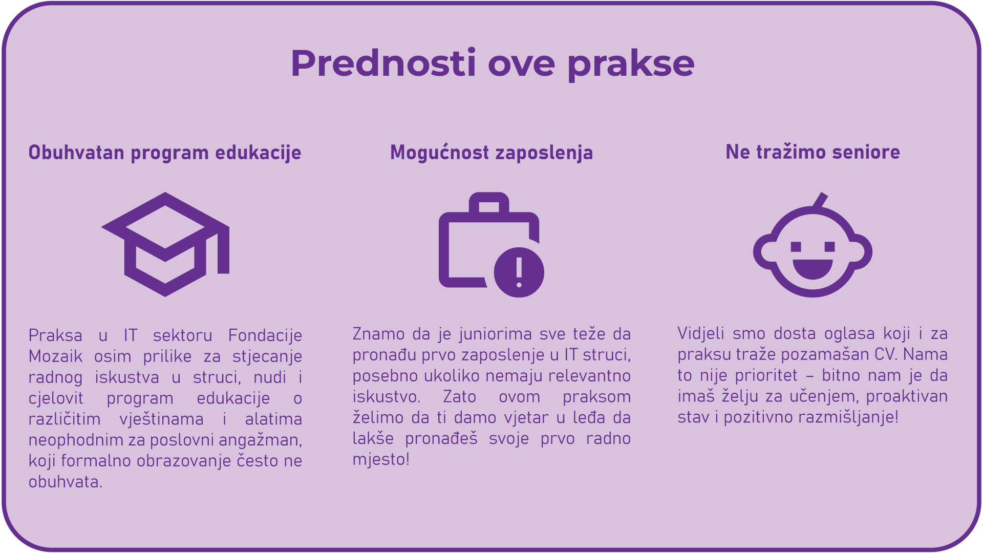 IT praksa nudi mogućnost mladim tehnološkim entuzijasticama i entuzijastima da steknu praktično iskustvo u oblasti informacionih tehnologija. Rad na raznim IT projektima ti pruža priliku za učenje o bazama podata, digitalnoj transformaciji, ali i savladavanju korištenja različitih digitalnih alata, što može biti korisno za buduću karijeru u IT sektoru. 🖥⌨