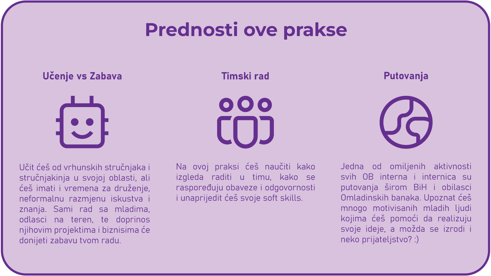Praksa u Omladinskoj banci ti donosi priliku da se angažuješ u radu sa mladima, promovišeš njihove društveno-korisne aktivnosti i daš svoj glas omladini u zajednici. Ovo iskustvo ti može pomoći u razvijanju liderstva, timskog rada i organizacionih vještina, kao i u razumevanju izazova s kojima se suočavaju mladi danas. 👩🏻🤝🧑🏻