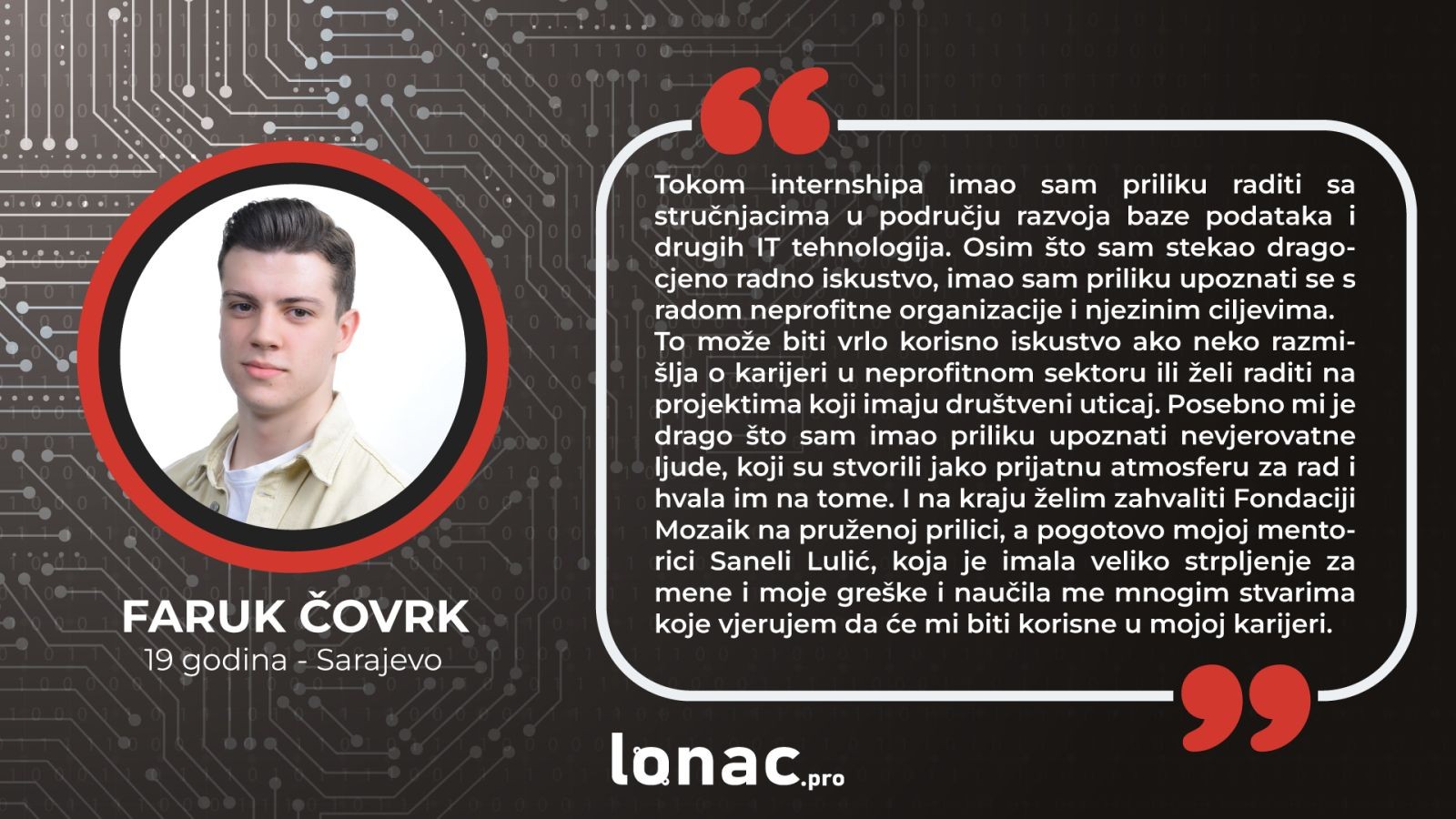 Vjerujemo da ti najviše znači da pročitaš iskustva bivših interna i internica i iz prve ruke saznaš kako će ti ova prilika pomoći u profesionalnom razvoju. Zato u nastavku pročitaj šta Faruk Čovrk kaže o svom iskustvu u ovom timu: