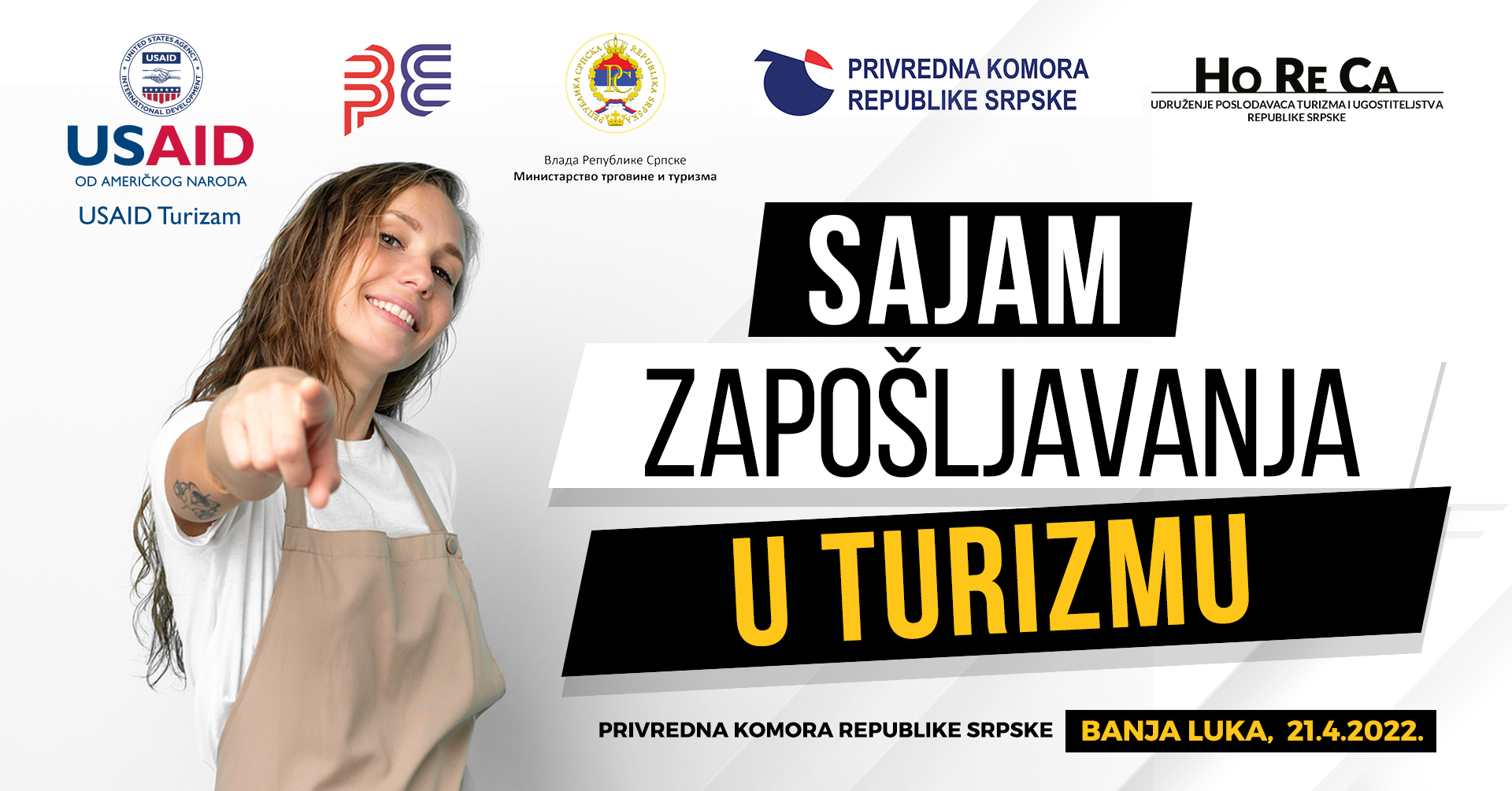 Sajam zapošljavanja u turizmu, koji obuhvata poslodavce regije Banje Luka i Teslić, biće održan u četvrtak, 21. aprila 2022. godine, u periodu od 10.00 do 14.00 časova u prostorijama Privredne komore Republike Srpske (Branka Ćopića 6, kod Mercatora).