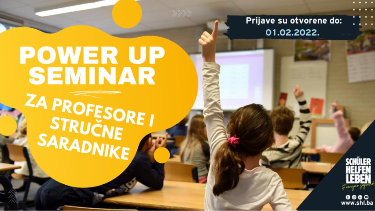 Fondacija Schüler Helfen Leben i ove godine organizuje Power Up Seminar za profesore i profesorice i stručne saradnike i saradnice. Seminar je namijenjen onima koji direktno rade sa Vijećima/Savjetima učenika/učenica u nekoj od srednjih škola u Bosni i Hercegovini.