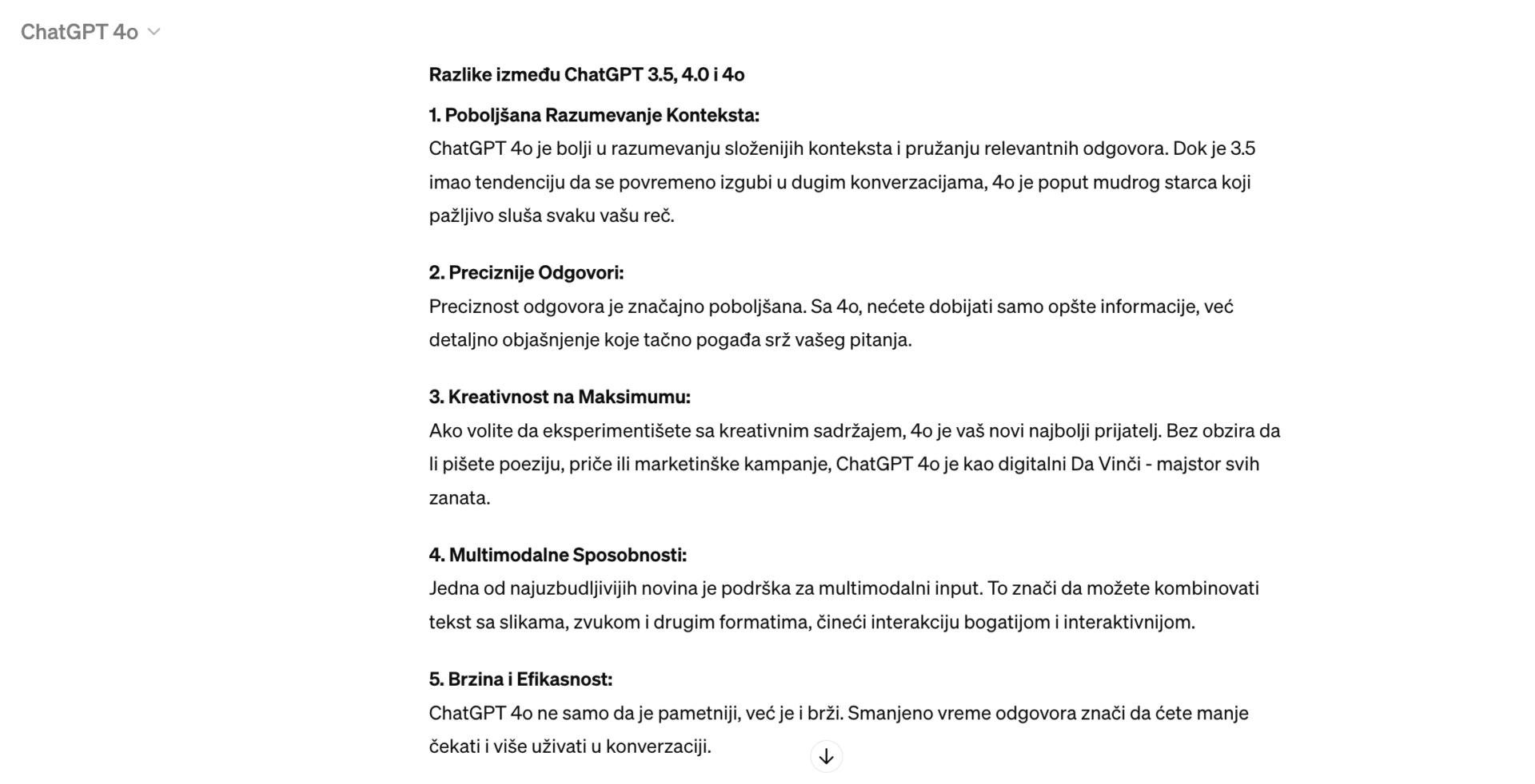 Na internetu se već može pronaći bezbroj članaka i videa na ovu temu, detaljnih analiza, a naravno i poneka teorija zavere. Zato sam ja odlučila da odem direktno do izvora, odnosno pitala sam GPT šta je to toliko bolje i naprednije kod 4o verzije, u odnosu na 3.5 i 4.0.