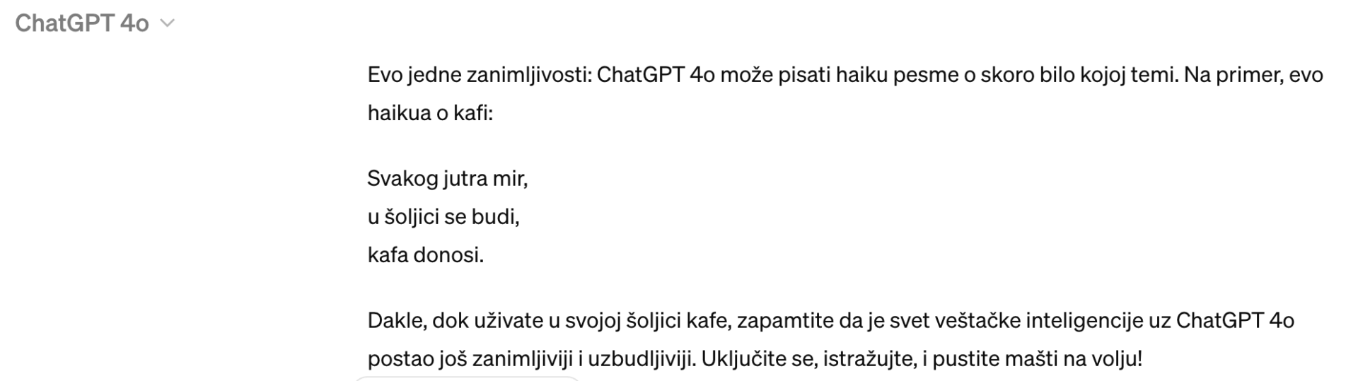 Ok, na prvu ne deluje da je vredno tolikog hajpa koji se podigao u prethodnih nekoliko dana, ali verujem da ću tokom korišćenja imati bolji uvid u razlike koje donosi nova verzija. Iako sam koristila ChatGPT-4o za prikupljanje ovih informacija, i dalje je pravio neke pravopisne greške, tako da verujem da na engleskom bolje funkcioniše. Svakako me raduje smanjeno vreme za odgovor, to će definitivno biti korisno kod dužih razmena sa Chatom, kao i kombinovanje teksta sa slikama, zvukom i drugim formatima. Ispod ću ostaviti malo detaljnije poređenje ova tri modela, ali, pre toga ću podeliti funkcionalnost koja me je najviše oduševila, primarno radi zabave: