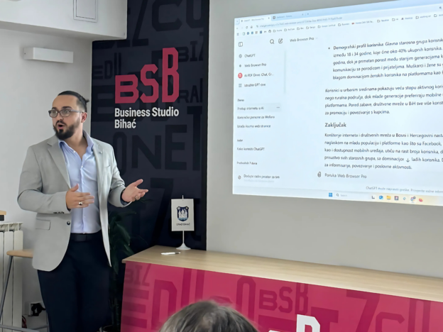 Sinoć je u okviru Business Studio Bihać održana prezentacija na temu “Kako da ChatGPT postane tvoj zaposlenik”.
