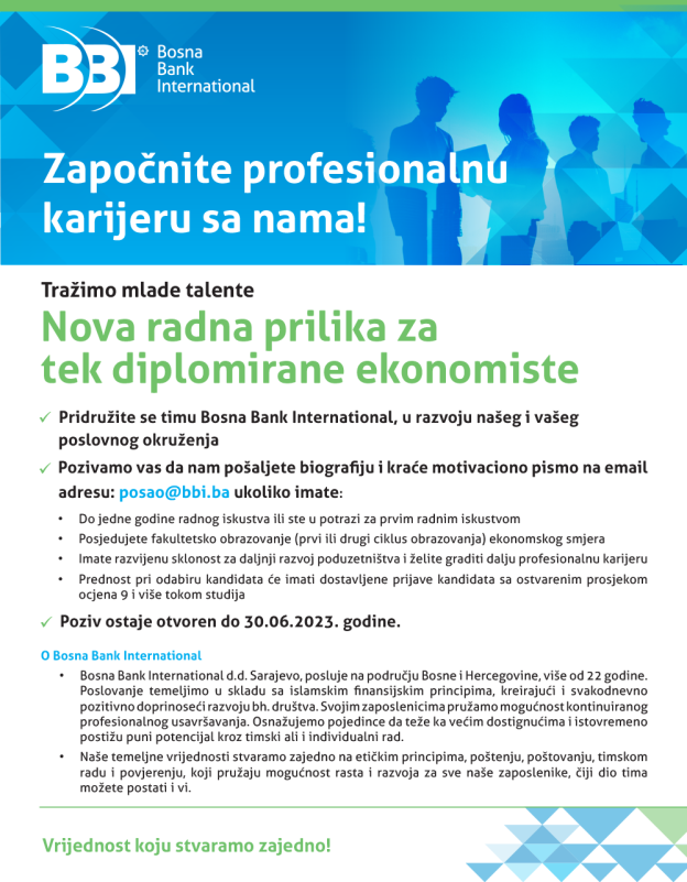 Zainteresirani, diplomirani ekonomisti svoju biografiju i kraće motivaciono pismo mogu poslati na email adresu: posao@bbi.ba. Prednost pri odabiru će imati kandidati sa ostvarenim prosjekom ocjena 9 i više tokom studija. Poziv je otvoren do 30.6.2022