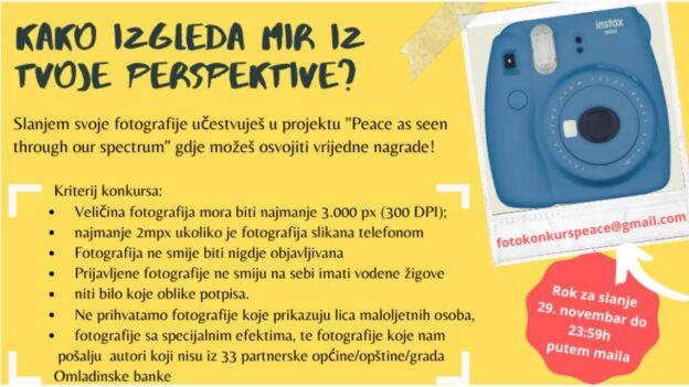 Ovim putem pozivamo sve mlade iz 33 partnerske opštine/općine/grada Omladinske banke da se prijave na foto-konkurs pod nazivom “Peace, as seen through our Sprectrum” .